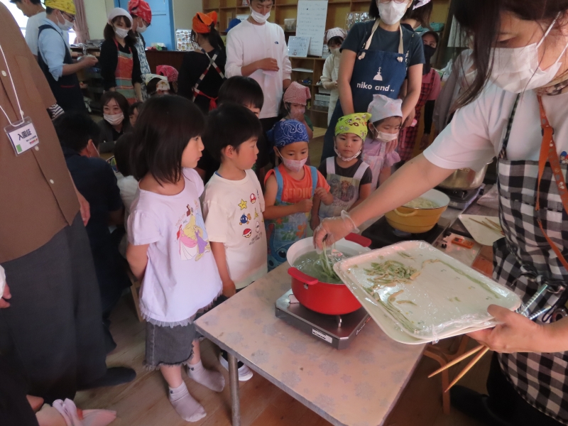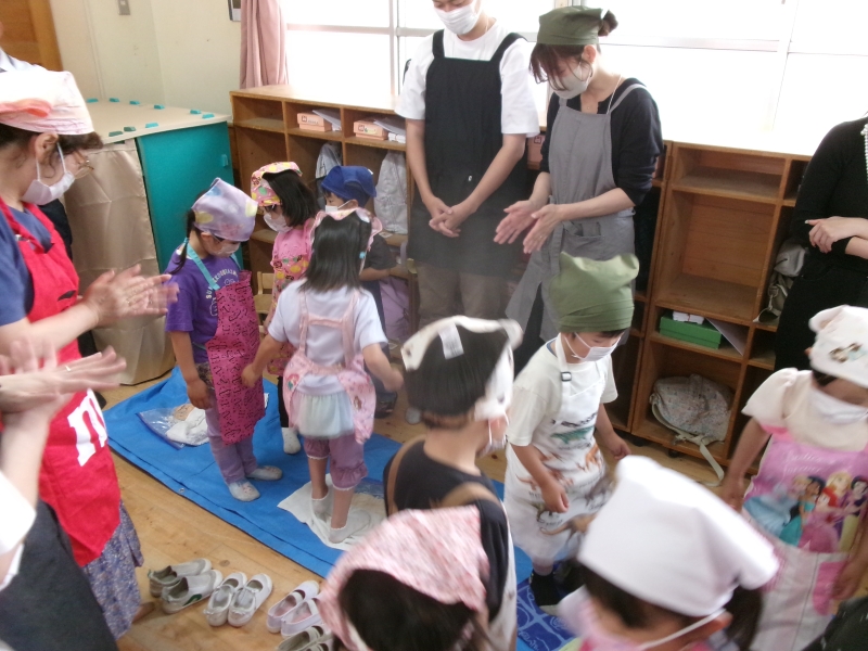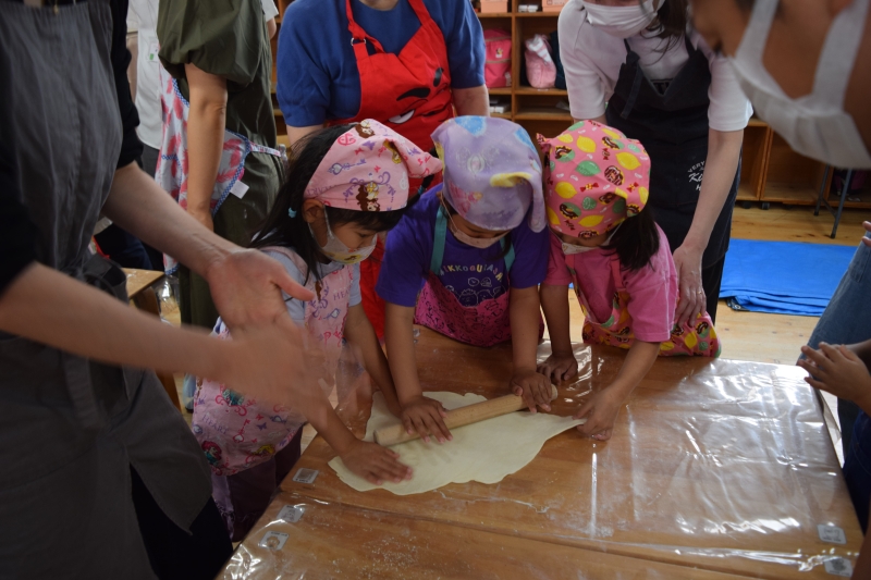 【ゆり組5歳児】袋に入れた生地を足で踏んでコシを出す工程から、うどん作りをしました。