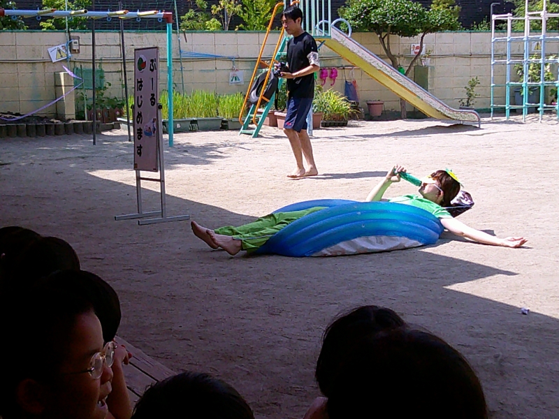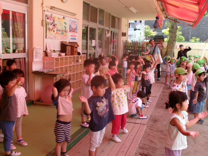 今年も子ども達が楽しみにしていたプール開き!プールの準備をしていると、なんとカッパが!?登場し、いきなりプールにダイビング!!その後、プール遊びの約束事を教えてもらいみんなで確認しました。