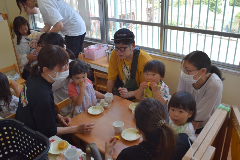 【たんぽぽ組2歳児】「今日のおやつはなにかなー」と親子でおしゃべりしながら3時のおやつを食べました。