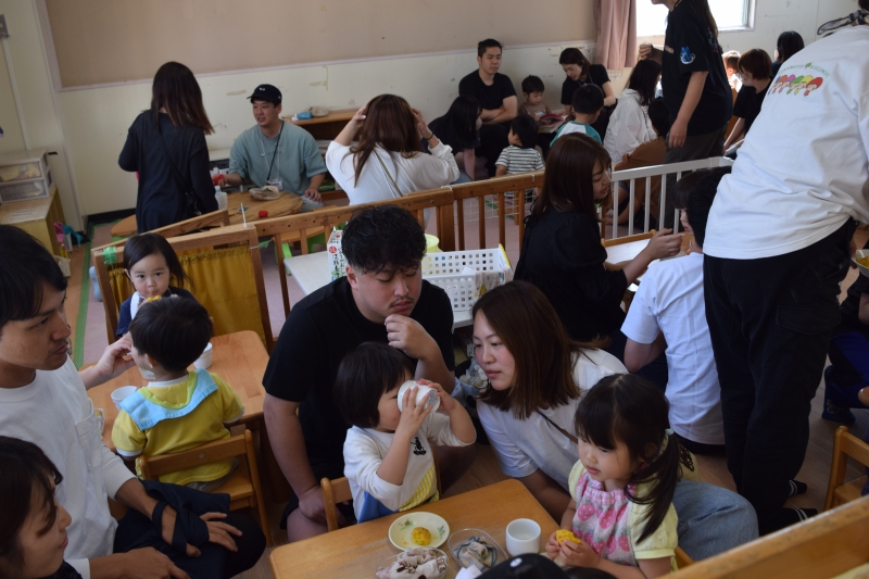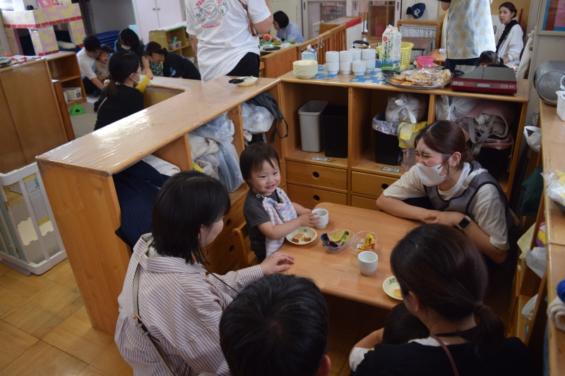 【ちゅうりっぷ組1歳児】おやつを保護者のかたと一緒に食べることができてうれしい子ども達。