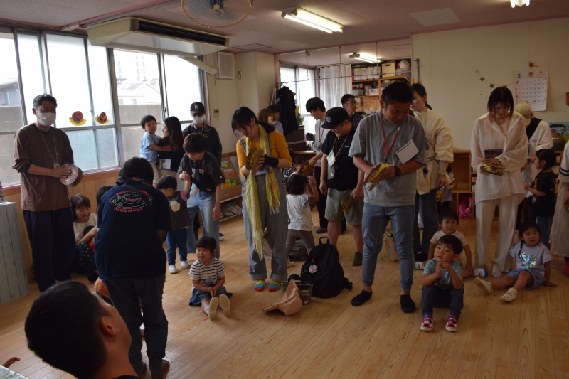 完成させた太鼓を持って、音楽に合わせてたたいて鳴らして遊びました。みんなリズムにのって喜んでいました!