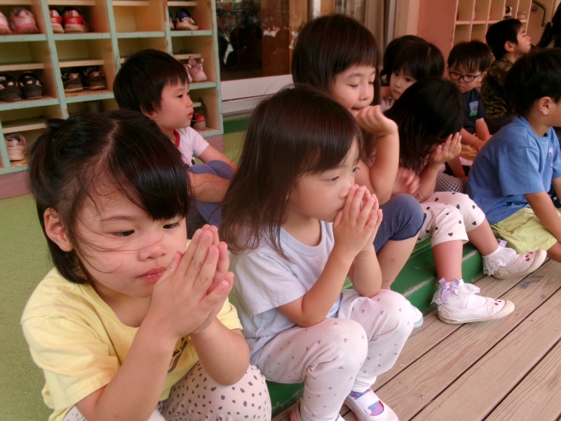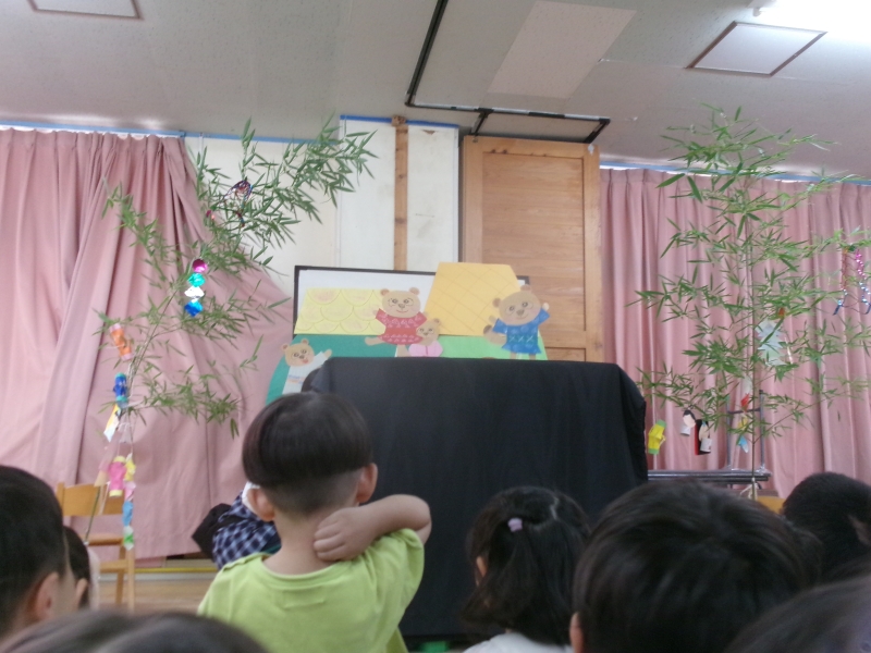 七夕の集いでは、みんなが作った七夕飾りの紹介からスタート。そのあとは、「たなばたウキウキねがいごとの日」というペープサートを見ました。