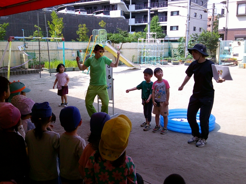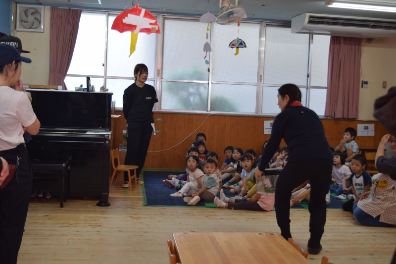 進級&新入児を迎えたこともあり、4月のお楽しみ会では保育園での楽しい遊びや約束事などを改めて保育士が寸劇を交えながら楽しく伝えました。