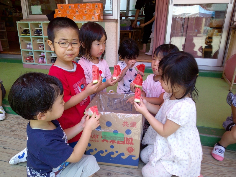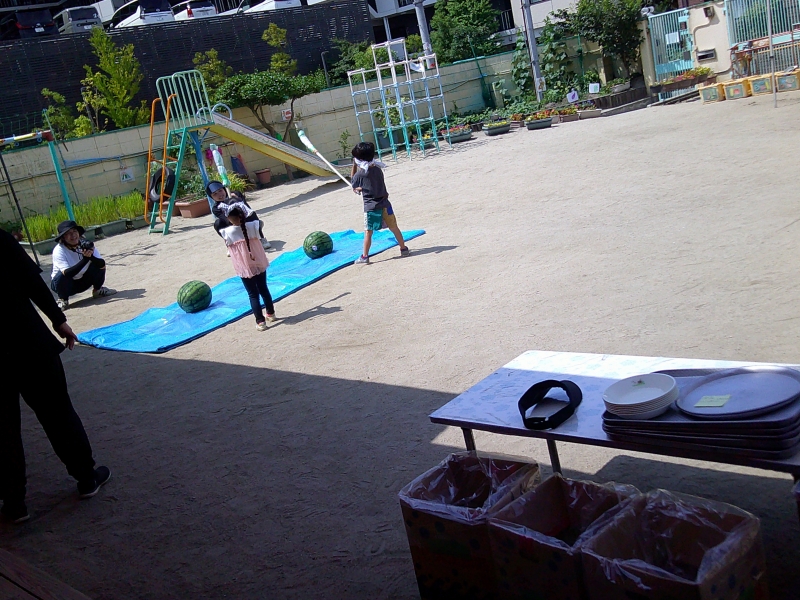 プール遊びの約束事を教えてもらったお礼にカッパさんからスイカを頂き、そのスイカで、ゆりぐみさんがスイカ割りをしてくれて美味しく頂きました♪