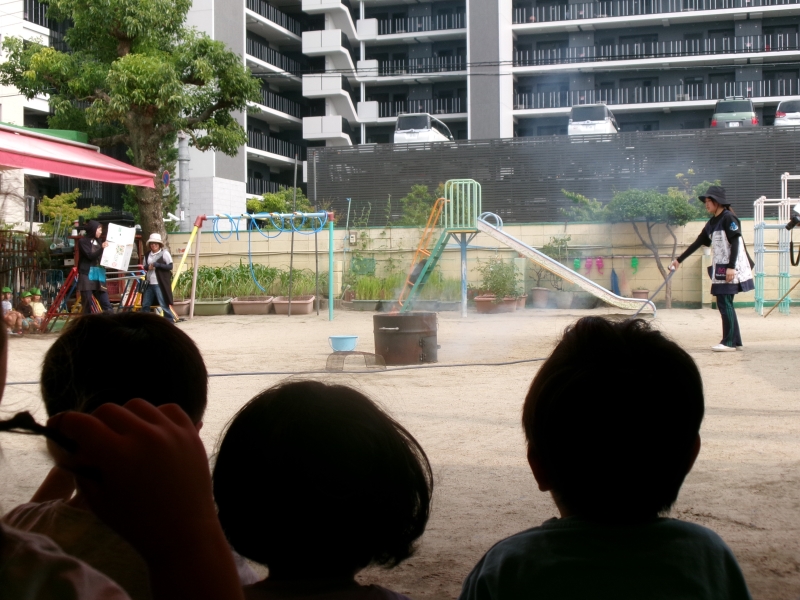 消火訓練の様子を応援したり、消防車にも興味津々の子どもたちでした♪