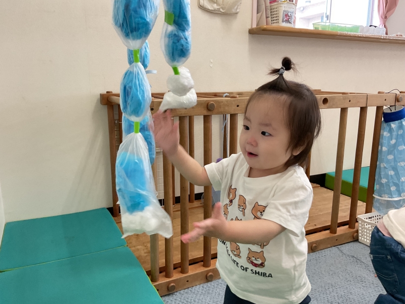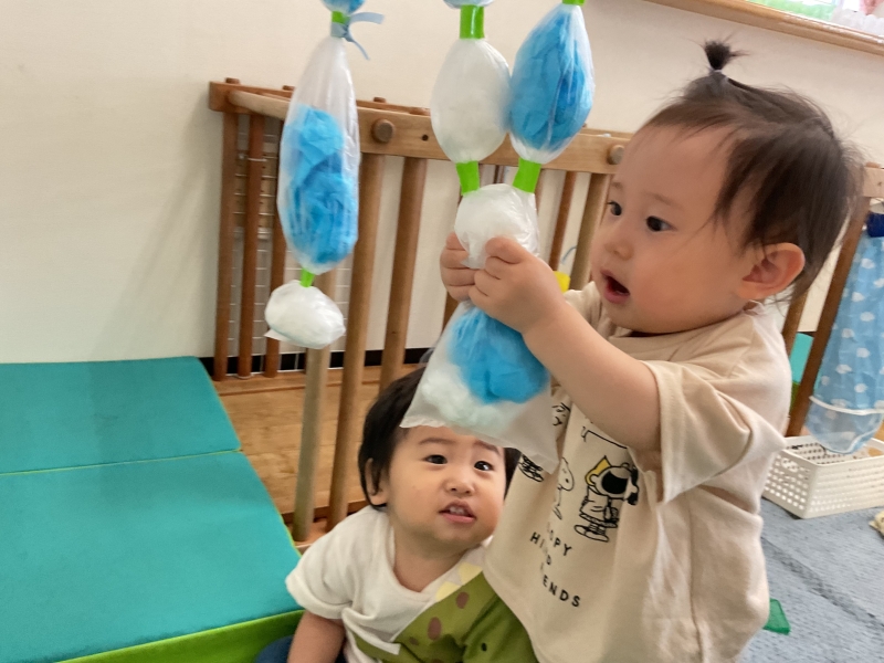傘袋にフラワー紙を詰めて雨粒を表現しました。子どもたちは興味津々で触ったり引っ張ったりし、感触を楽しんでいます♪