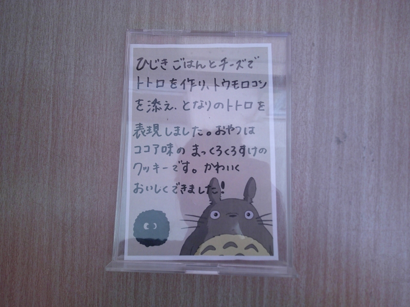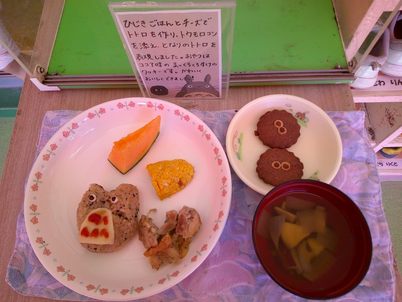 6/20お楽しみ会の献立は【トトロ風ひじきごはん・のり塩からあげ・とうもろこし・すまし汁】で、おやつは【まっくろくろすけクッキー】でした。子どもたちも「トトロやぁ~!かわいい!」と喜んで食べてくれていましたよ♪