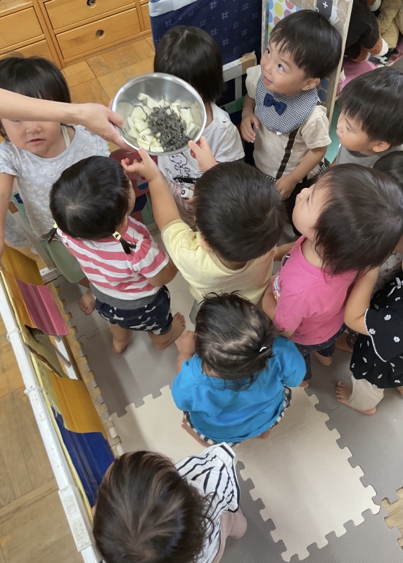 育てていたカブを収穫しました。「うんとこしょ」「どっこいしょ」と引っぱって抜くと、子どもたちは「わぁ~」と大喜び♪塩昆布とあえて食べると、野菜が苦手な子どもたちも「おいしー」とぱくぱく食べていました。