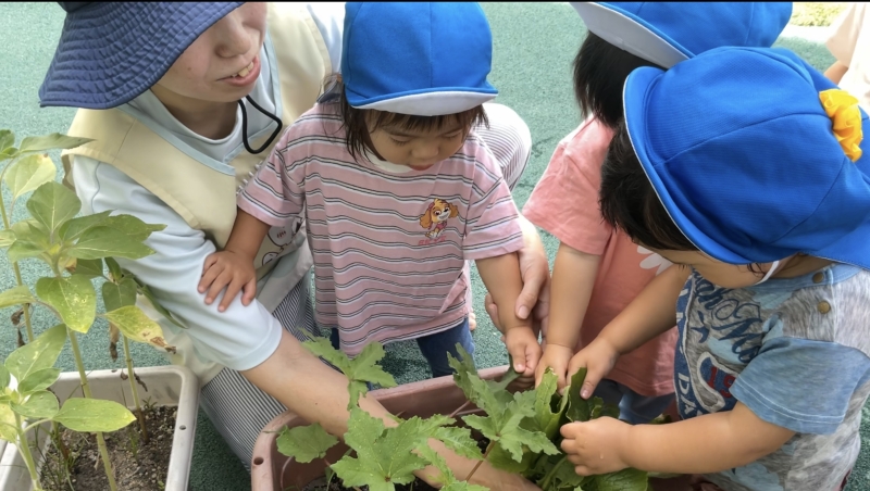 ひまわりの種まきをしました。「ぽいっ!」と言いながら種まきを楽しんでいた子どもたち。保育士と一緒に水やりもしてくれています♪