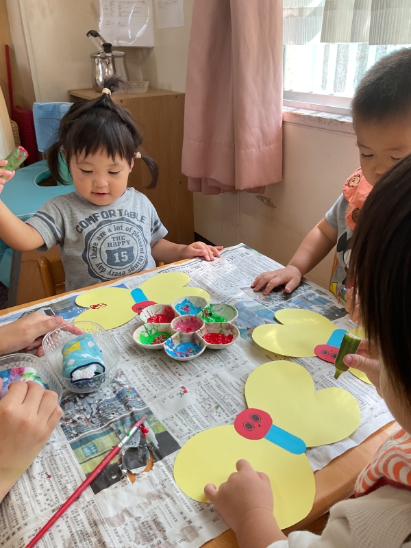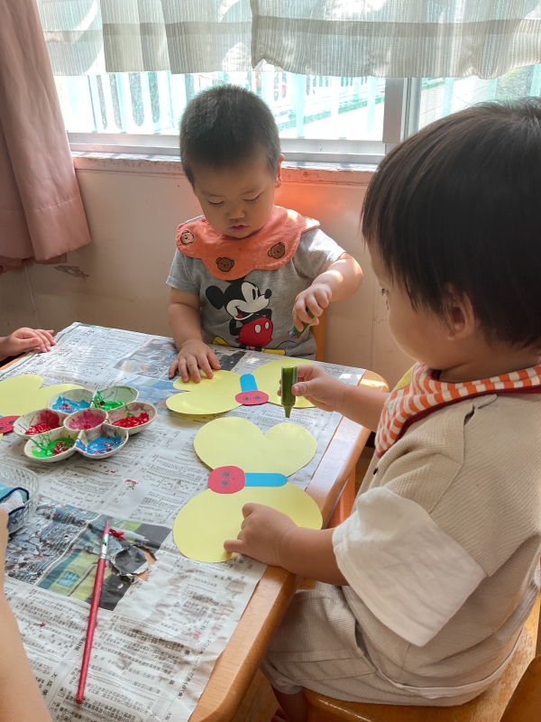 育てていたオクラを収穫してスタンピング!をしました。最初はオクラの感触にビックリ!し、そーっと握っている子もいましたが、絵の具をつけて模様ができるとポンポンと押して楽しんでいました。