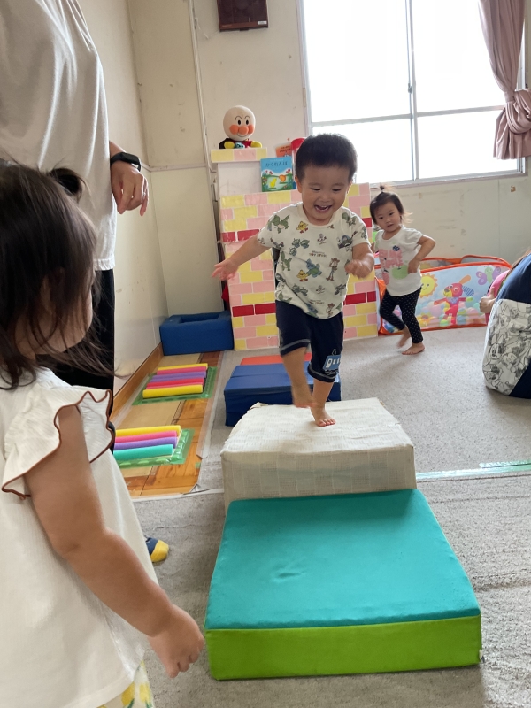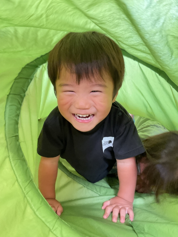 部屋でサーキット遊びをしました。斜面からクッションにジャンプしたり、長いトンネルをくぐったりと体を思いきり動かして楽しんでいます♪