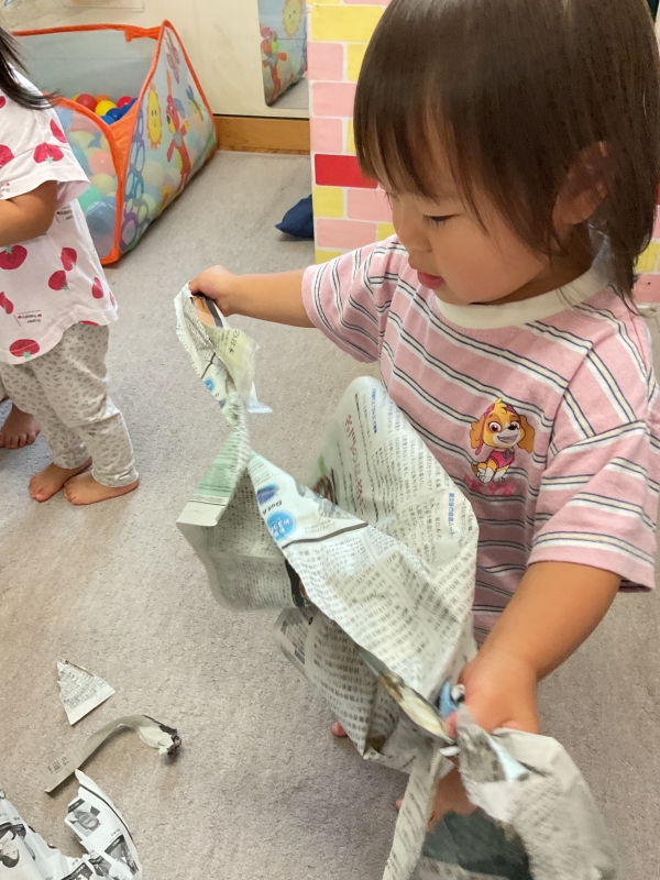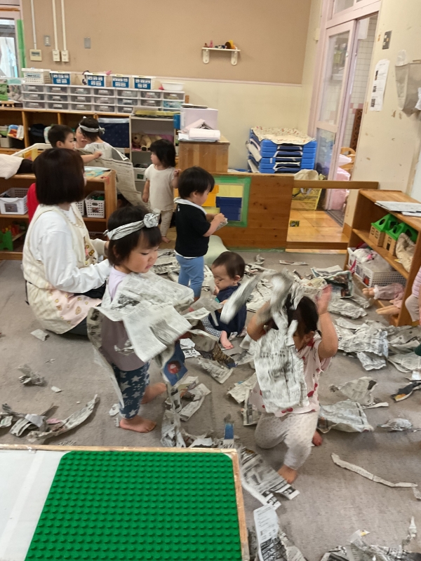 部屋で新聞遊びをしました。ビリビリと思い切り破ったり、破った新聞紙を舞わせたりと全身で楽しんでいました♪また、新聞紙で素敵な衣装を作ってもらい大変身していました☆