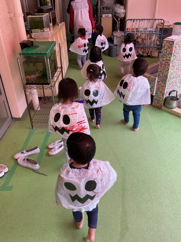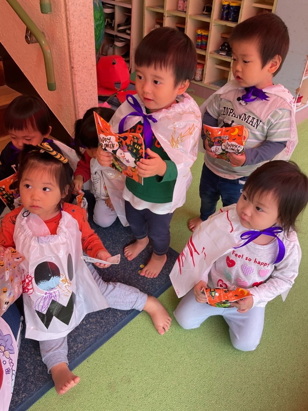 自分たちで作ったおばけのマントを着て、ハロウィンのお菓子をもらいに行きました!ドキドキしながらも無事にお菓子をもらって嬉しそうな子ども達です。