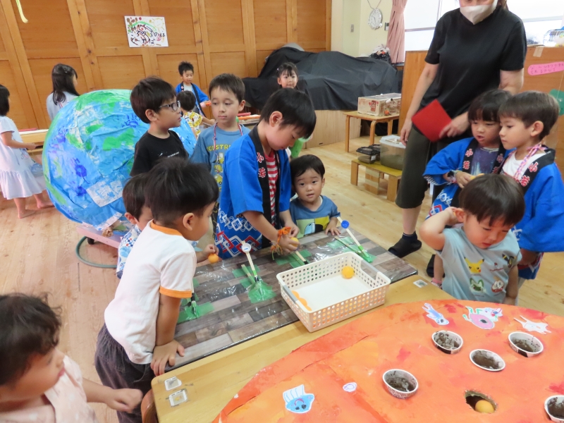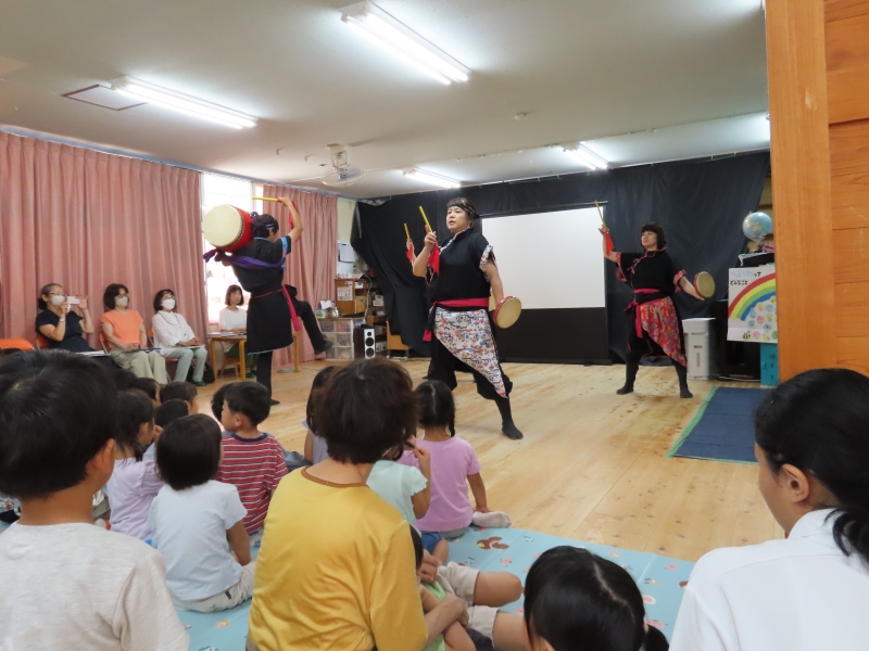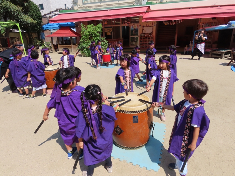 夏祭りのオープニングで、子どもたちは和太鼓「豊年太鼓」を披露しました。声を出し、力強く太鼓をたたく姿を多くの人に見てもらい、子どもたちにとって貴重な経験となりました。 また、夏祭りのお店当番では、年下のお友だちに優しく遊び方を教えてあげる姿も見られました。