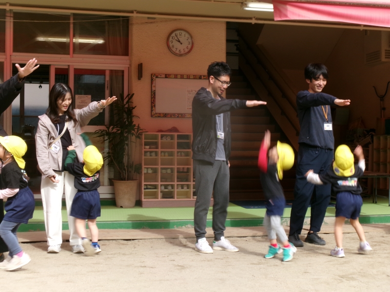 はじめてのウエルネス参観!お家の人とのふれあい遊びでは、一緒に押し合いをしたり抱っこしてもらって笑顔いっぱいの子ども達。お家の方も「おもたい~」と言いながらも嬉しそうに成長を沢山感じられる良い時間を過ごせました。