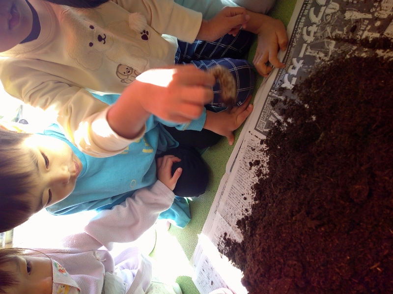 夏に飼育していたカブトムシが卵を産み、幼虫になりました。 土の中から幼虫を見つけると、「いた!」と驚いたり、興味津々でのぞき込んでいる子どもたちです♪