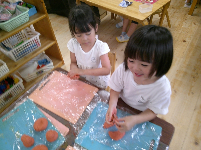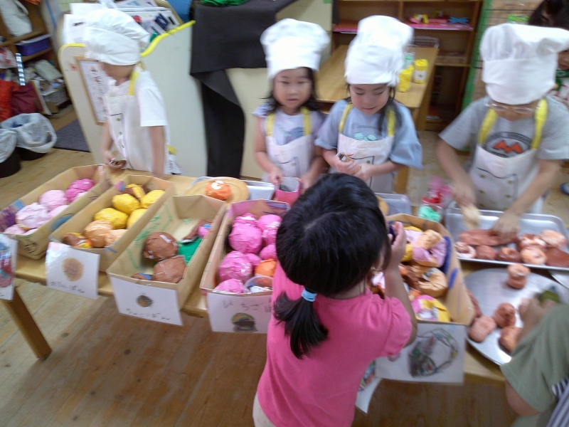 夏まつりに向けて、子どもたちと一緒にパン作り‼できあがったパンを並べて「すみれ組きらきらパン屋さん」のオープン!子どもたちは笑顔いっぱいで「いらっしゃいませ!」とお店屋さんになりきって楽しんでいました。