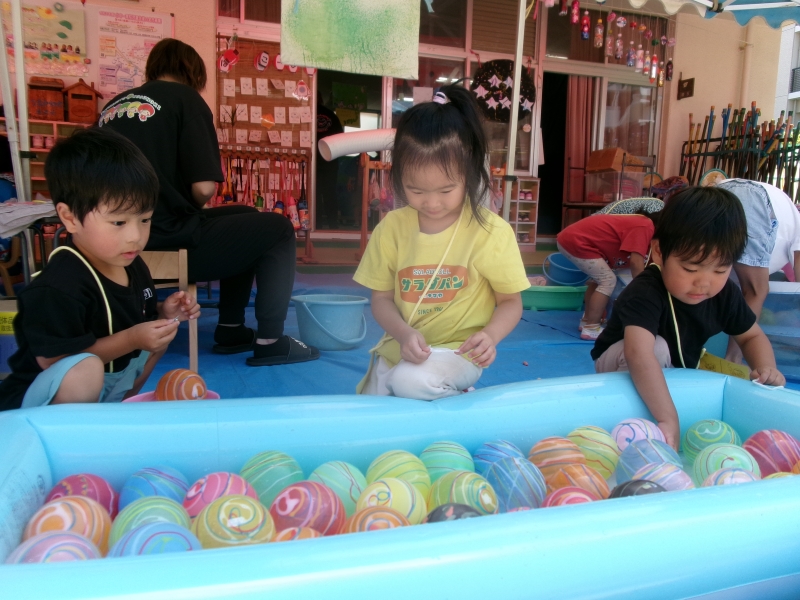 夏まつりのヨーヨー!釣りあげたと思ったら途中で落ちてしまい「あ~あ、落ちちゃった。」と残念そうな表情!「ひとつもらっていいよ。」と言われ「やったー!」と大喜びの子どもたちです。スーパーボールすくいでは、「アヒルさんかわいい」「キラキラがきれい」と楽しそうにすくっていました。