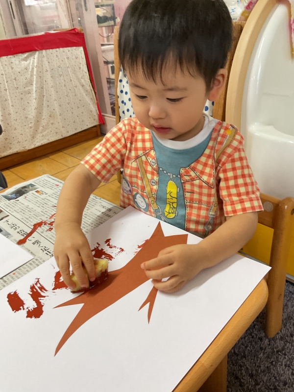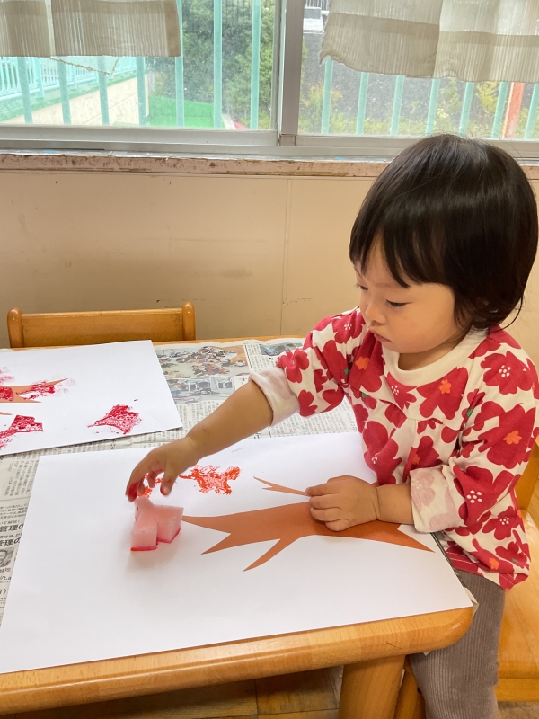 イチョウ型のスポンジスタンプをしました。 好きな色を選び、きれいな葉っぱを自由につけていきました。 出来上がるとパチパチ手をたたいて喜んでいた子どもたちです♪