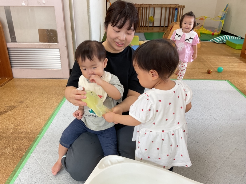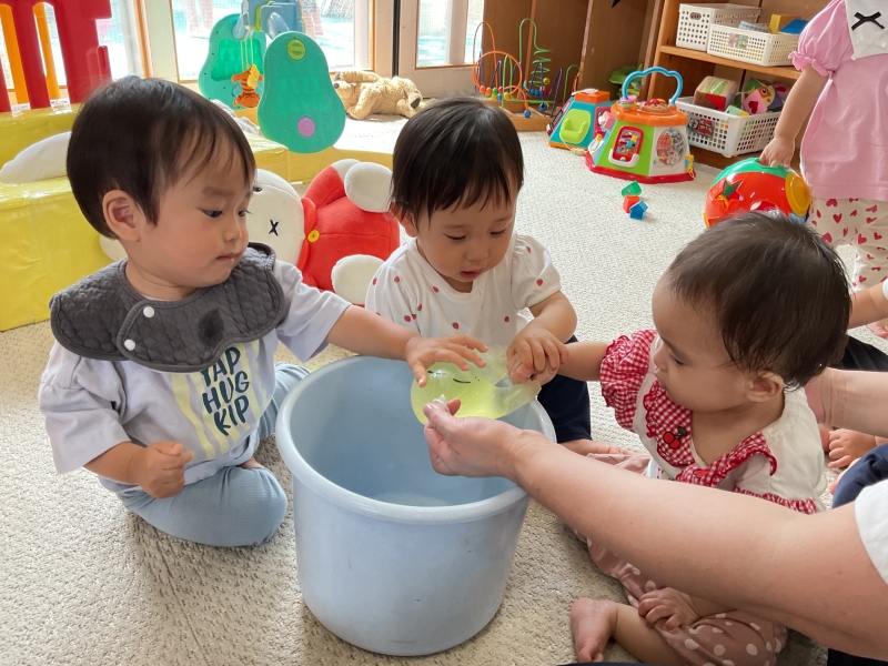 ゴム手袋に色水をいれたもので感触遊びを楽しみました。はじめは(これなんだ?)と不思議そうにしていまいたが、冷たくてプニプニが気持ちよくてずっと触っていた子どもたちです。