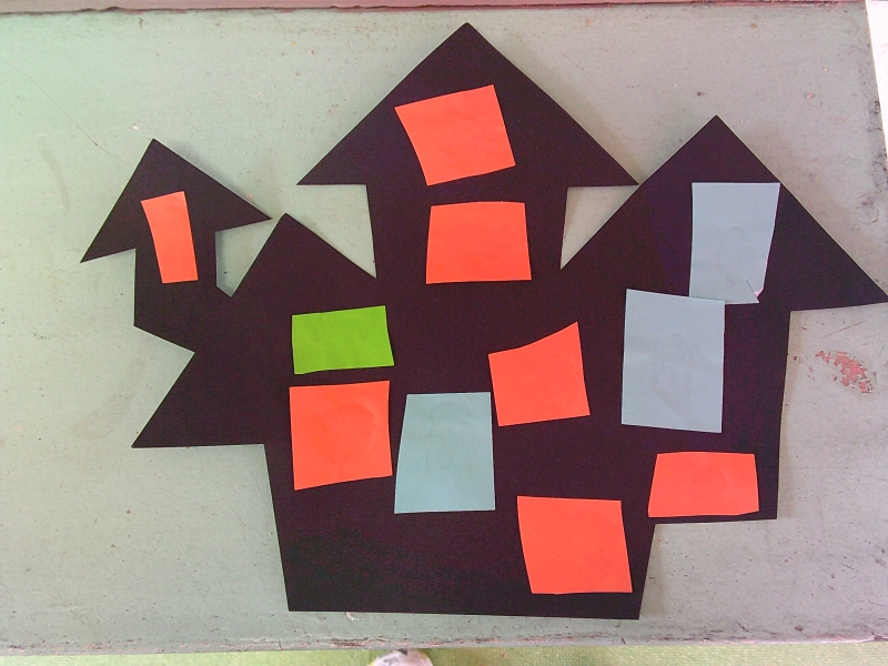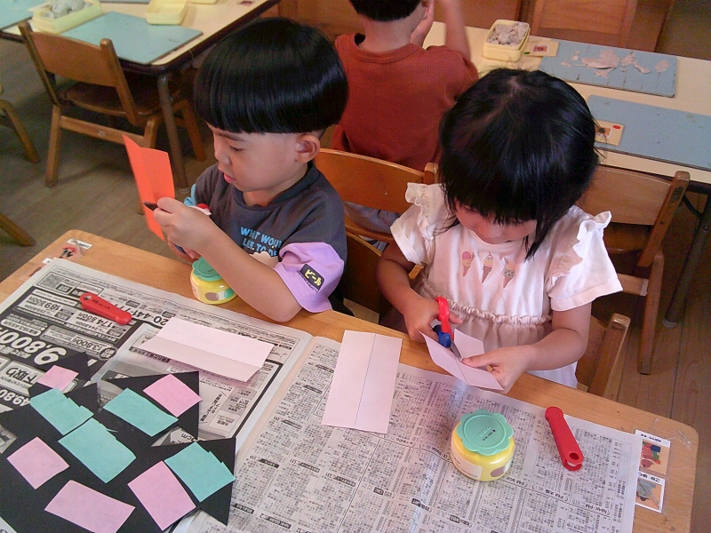 製作あそび!折り紙の色を選ぶと、はさみを使っての連続切りに挑戦!難しい所は保育士が手を添えて一緒に切り、のりで貼るときには「おばけどこから出てくるかな~」と友だちと話しながらおばけマンションを作っていました。